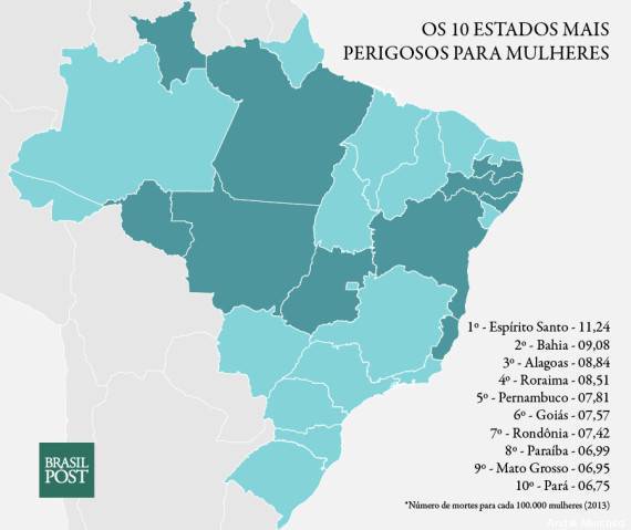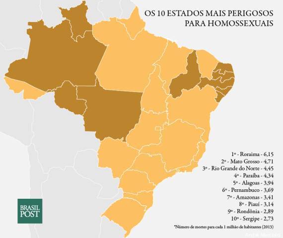 Com base em pesquisas do Mapa da Violência, do Ipea e do GGB, o Brasil Post fez um ranking dos estados mais perigosos para ser uma mulher, um negro ou um homossexual. Confira o resultado nas listas com os números absolutos discriminados abaixo: